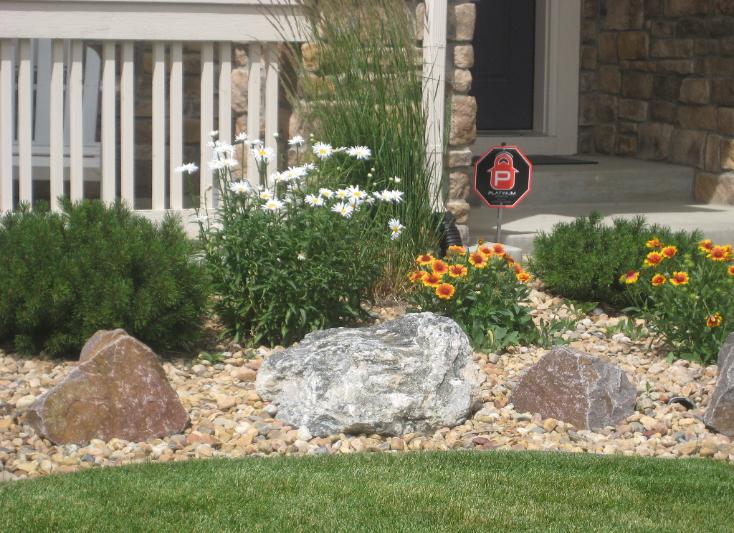 Small granite boulders used as an edge to separate the lawn from the garden backed by mugos and simple flowers in front are blanket