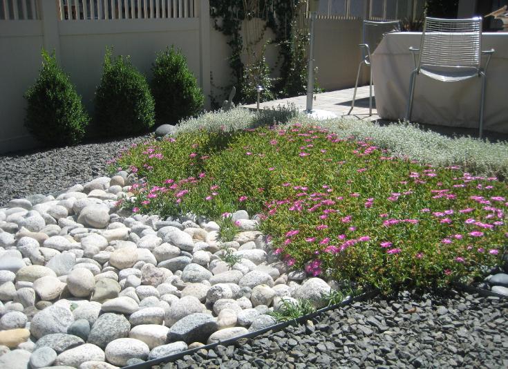Here a contemporary garden with loads of contrast highlights a blue stone with white granite. The plants shown are