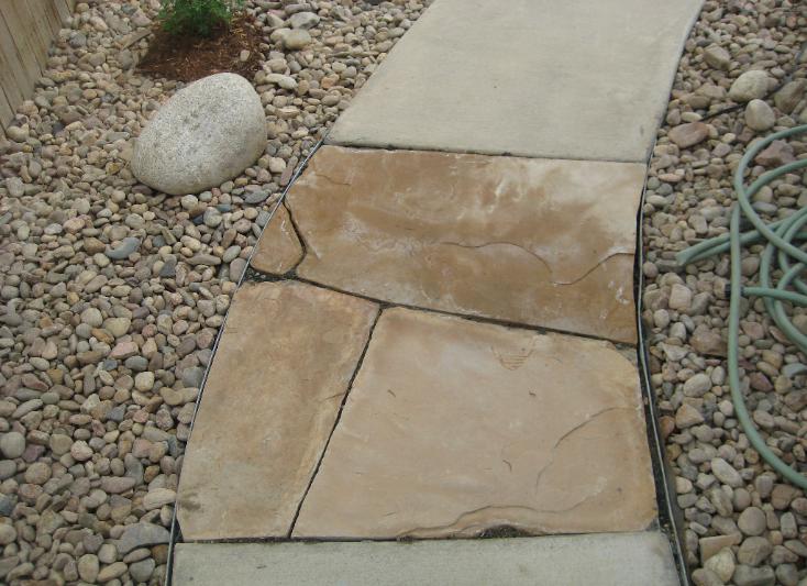 Cut flagstone this Arizona buff was installed as an inset to a walkway. It creates a creative touch to a concrete