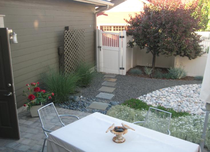 A good example of a patio yard without a lawn. You really don't miss it here. There is plenty of texture and plant life